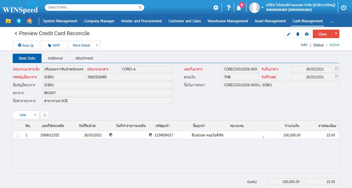 รายละเอียดหน้าต่างปรับยอดจากการรับชำระบัตรเครดิต Cash Management -> Cheque -> Credit Card Receive ->ปรับยอดจากการรับชำระบัตรเครดิต
