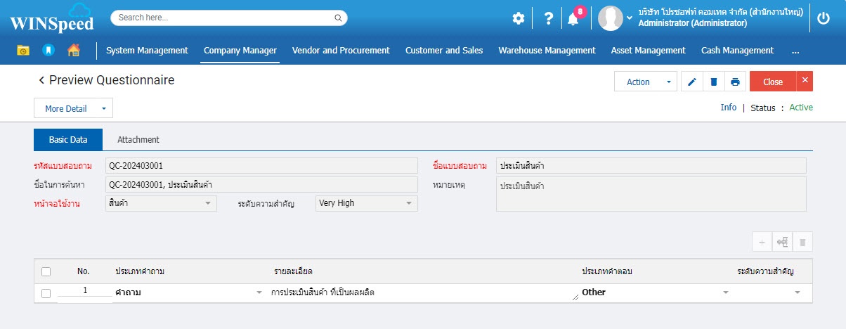 รายละเอียดหน้าต่างข้อมูลแบบสอบถาม Company Manager-> Setup -> Master -> ข้อมูลแบบสอบถาม