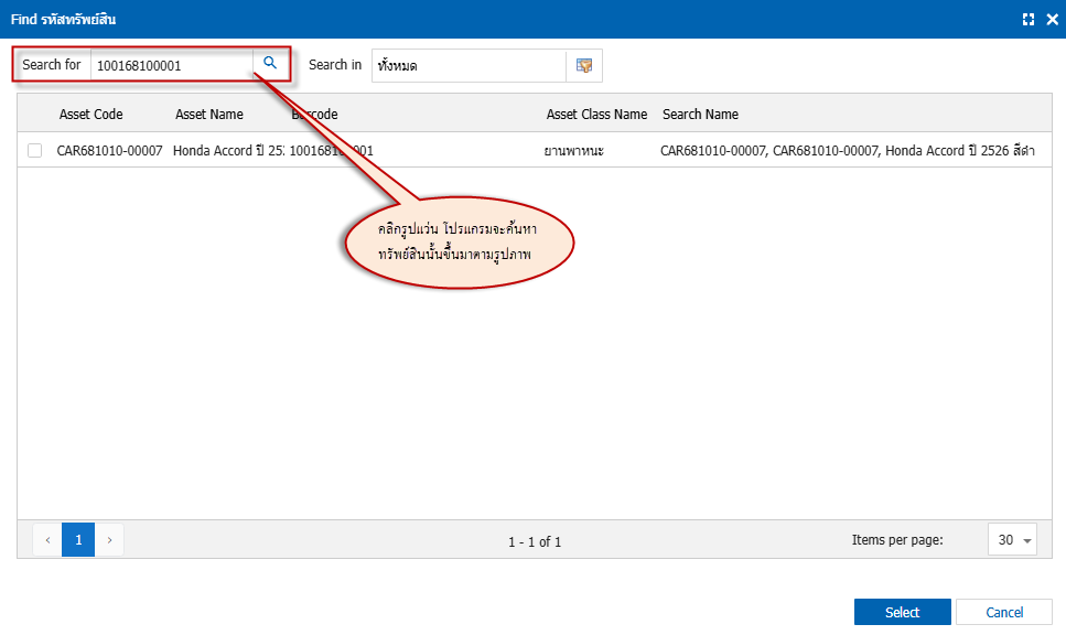 3.ทำการ Search for แล้วโปรแกรมจะค้นหาทรัพย์สินด้วย Bar Code รายการจะขึ้นมาตามรูปภาพ