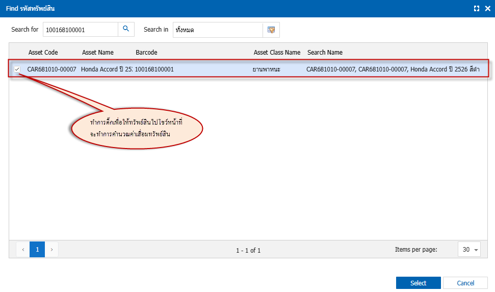 4.จากนั้นให้คลิกตามลูกศร เพื่อให้ทรัพย์สินนี้ไปที่หน้าต่างตรวจสอบทรัพย์สิน > คลิก Select