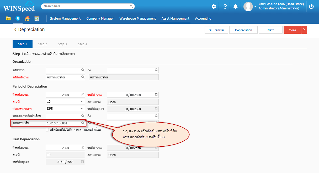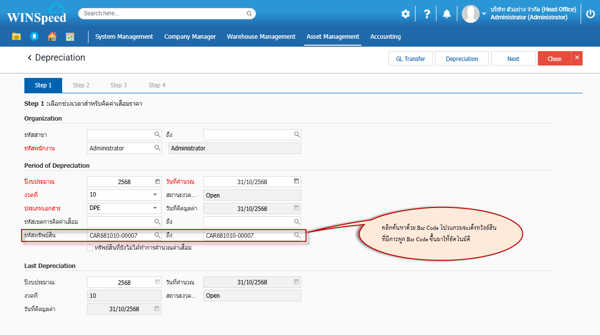 Q : ขั้นตอนการค้นหา Barcode ในหน้าต่าง คำนวณค่าเสื่อมทรัพย์สิน