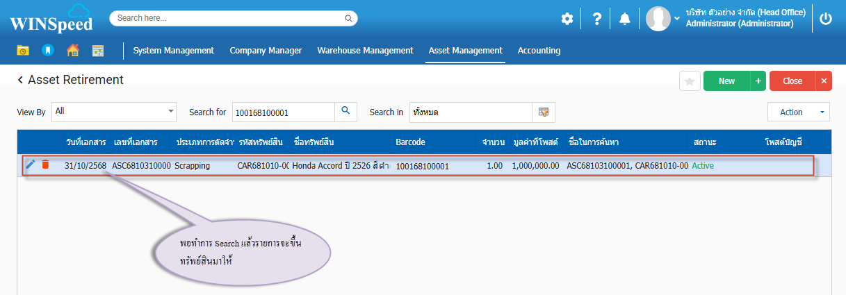 6. เมื่อมีการค้นหาทรัพย์สิน ด้วยรหัส Barcode