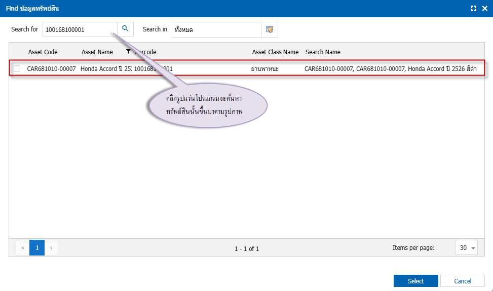 2.สามารถค้นหาทรัพย์สินด้วย Bar Code โดย Search In ด้วย บาร์โค้ด ตามรูปภาพด้านล่าง