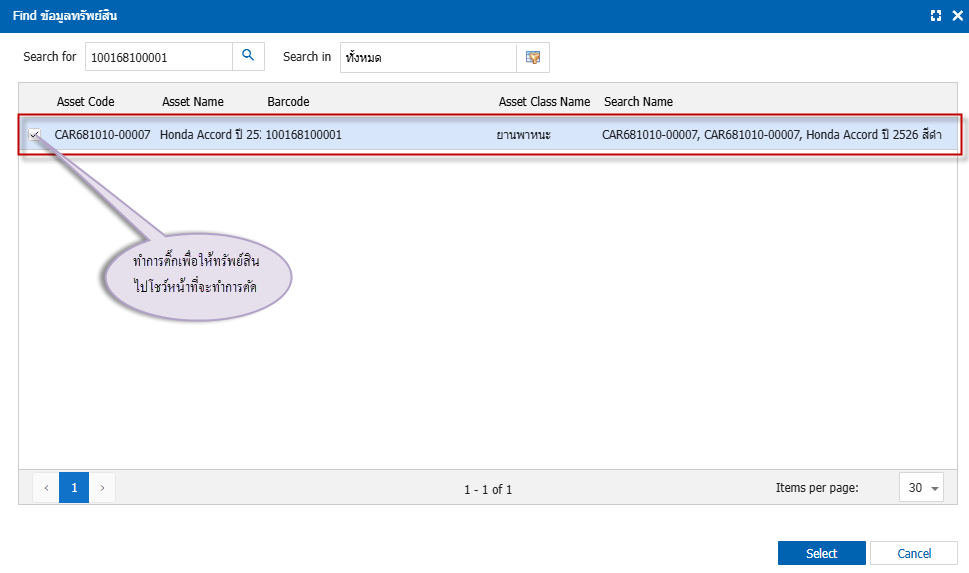 ขั้นตอนการค้นหา Barcode ที่หน้าต่างตัดจำหน่ายทรัพย์สิน