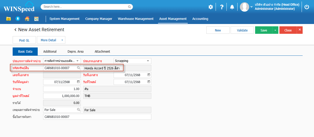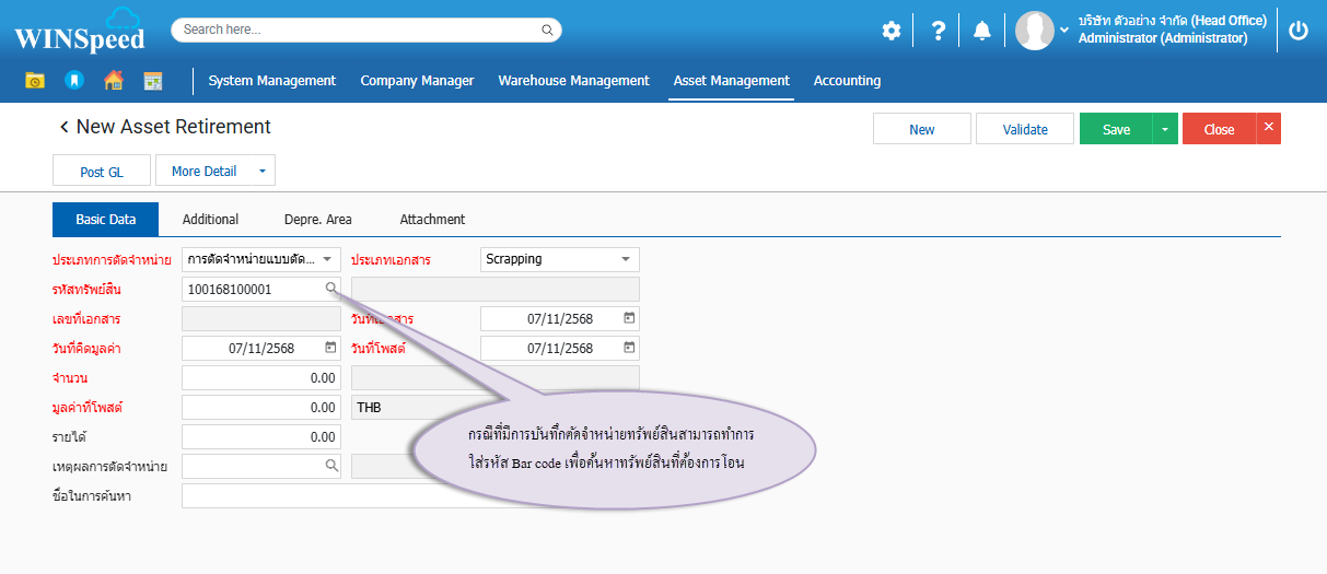 1.สามารถเข้าไปที่ระบบ Asset Management > Transaction > ตัดจำหน่ายทรัพย์สิน
