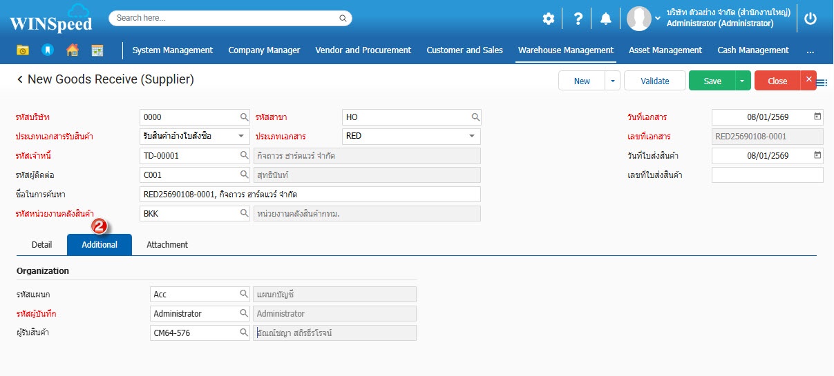 3.Detail เพื่อกำหนดรายละเอียดพื้นฐานรับสินค้า (จากผู้ขาย) เช่น ประเภทเอกสารรับสินค้า ประเภทเอกสาร เลขที่เอกสาร รหัสเจ้าหนี้ วันที่โพสต์ รหัสหน่วยงานคลังสินค้า เป็นต้น