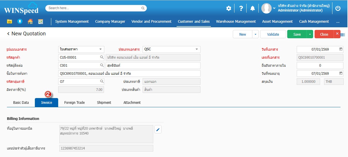 4.Invoice คีย์ข้อมูลที่เกี่ยวกับข้อมูลลูกค้าเพิ่มเติม ได้แก่ที่อยู่ในการออกบิล เงื่อนไขการชำระ งวดการชำระ โดยโปรแกรมเซตข้อมูลเบื้องต้นให้ตามการกำหนดที่ข้อมูลลูกค้า สามารถแก้ไขเปลี่ยนแปลงได้ที่หน้าต่างใบเสนอราคา