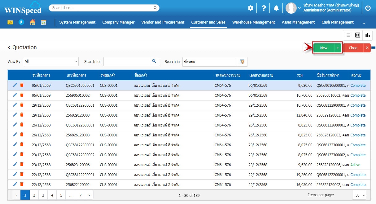 1.สามารถเข้าที่ระบบ Customer and Sales-> Transaction -> ใบเสนอราคา