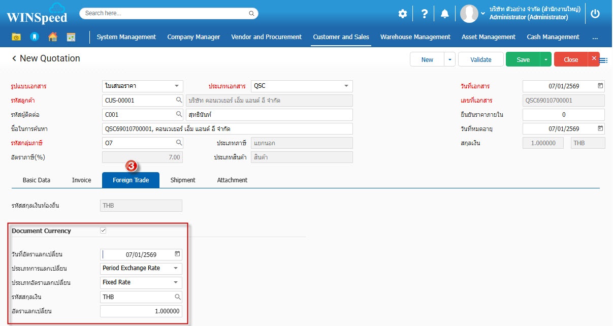 5.Foreign Trade กำหนดข้อมูลสกุลเงินกรณีสั่งซื้อสินค้าจากต่างประเทศ โดยเลือก Document Currency(1) -> กำหนดประเภทกรเลือกเปลี่ยน,ประเภทอัตราแลกเปลี่ยน,รหัสกุลเงิน และอัตราแลกเปลี่ยน(2)