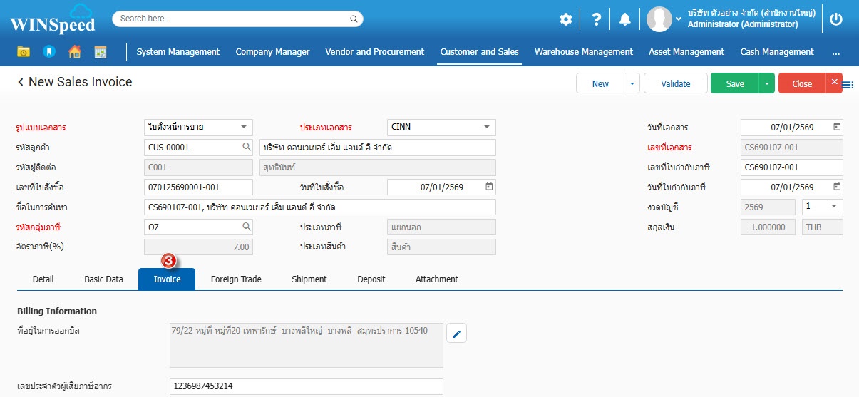 5.Invoice Basic คีย์ข้อมูลที่เกี่ยวกับข้อมูลลูกค้าเพิ่มเติม ได้แก่ที่อยู่ในการออกบิล เงื่อนไขการชำระ งวดการชำระ โดยโปรแกรมเซตข้อมูลเบื้องต้นให้ตามการกำหนดที่ข้อมูลลูกค้า สามารถแก้ไขเปลี่ยนแปลงได้ที่หน้าต่างใบตั้งหนี้การขาย