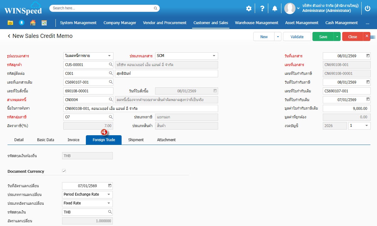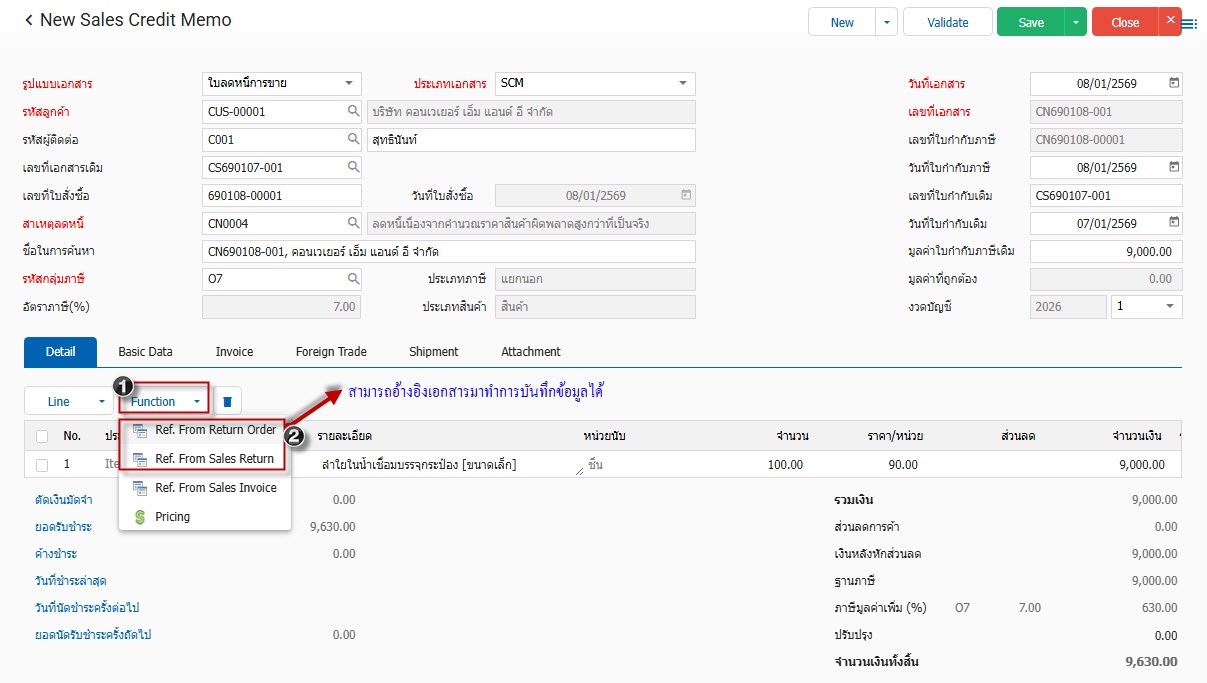 1.สามารถเข้าที่ระบบ Customer and Sales-> Transaction -> ใบลดหนี้การขาย