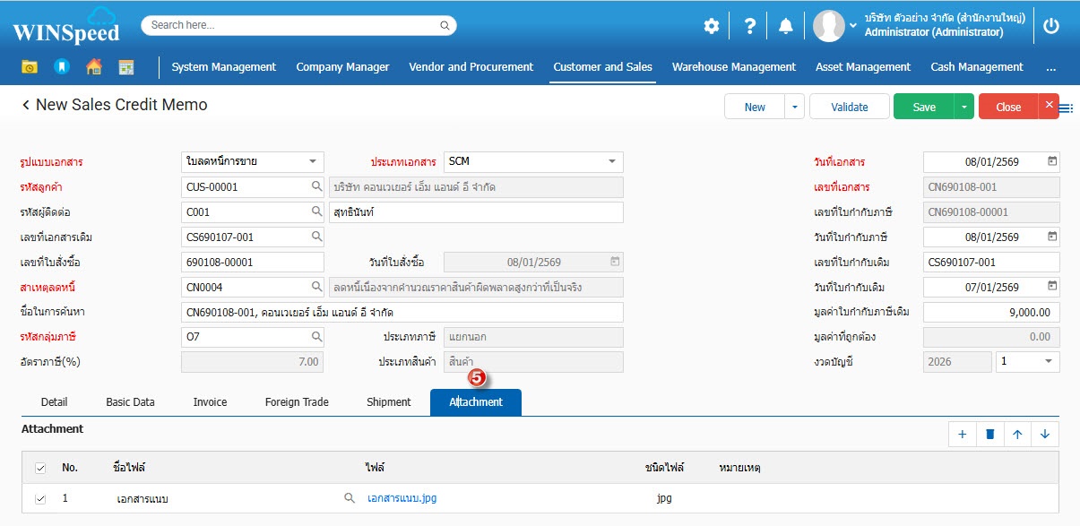 7.Attachment ใช้สำหรับกรณีต้องการแนบไฟล์เอกสารให้กับหน้าจอใบลดหนี้การขายเลขที่นั้นๆ สามารถแนบไฟล์ เช่น Word PDF EXCEl รวมถึงไฟล์รูปต่างๆ และ ไฟล์ ZIP เป็นต้น โดยสามารถจำกัดความจุของไฟล์เอกสารที่ใช้แนบได้