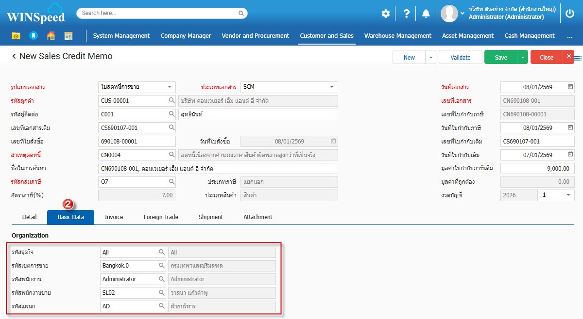 3.Basic Data กำหนดรหัสลูกค้า และรายละเอียดสินค้าที่ต้องการลดหนี้การขาย