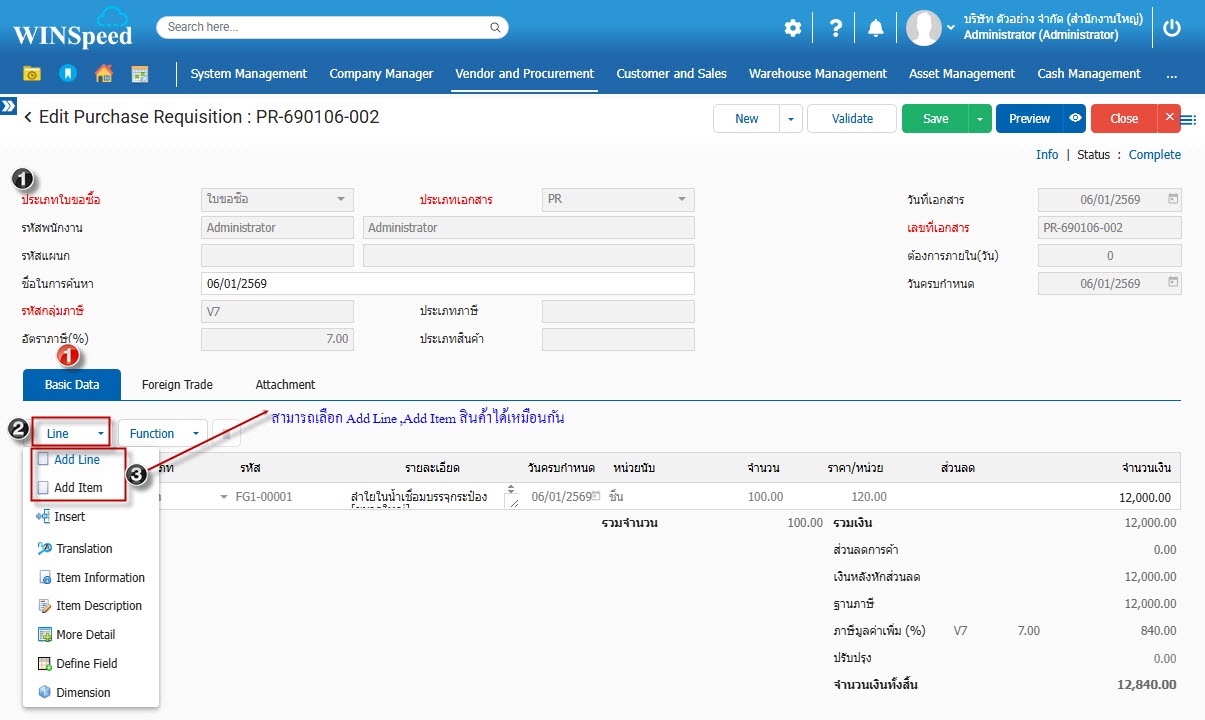 3.Basic Data บันทึกรายละเอียดเอกสารใบขอซื้อ เช่น เลขที่เอกสาร วันที่เอกสาร สินค้าที่ขอซื้อ จำนวน ราคา เป็นต้น