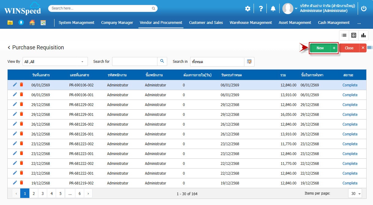 1.สามารถเข้าที่ระบบ Vendor and Procurement -> Transaction -> ใบขอซื้อ