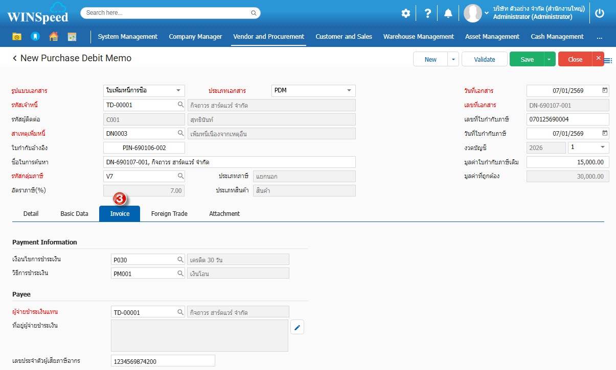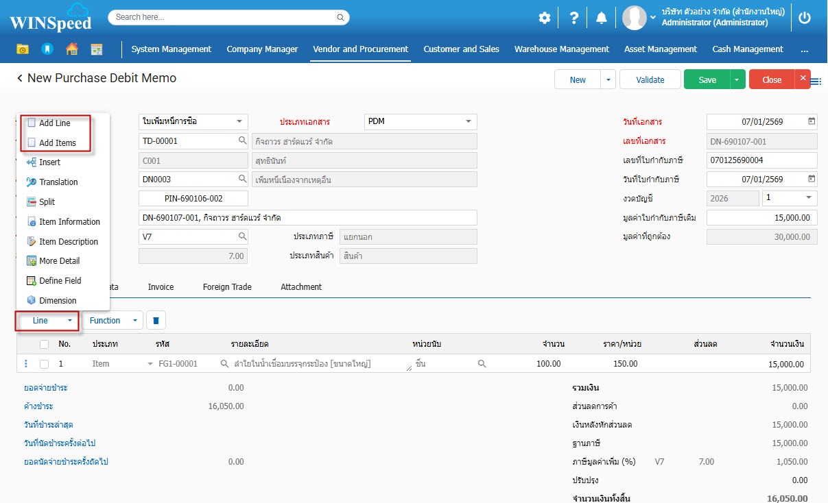 1.สามารถเข้าที่ระบบ Vendor and Procurement -> Transaction -> ใบเพิ่มหนี้การซื้อ