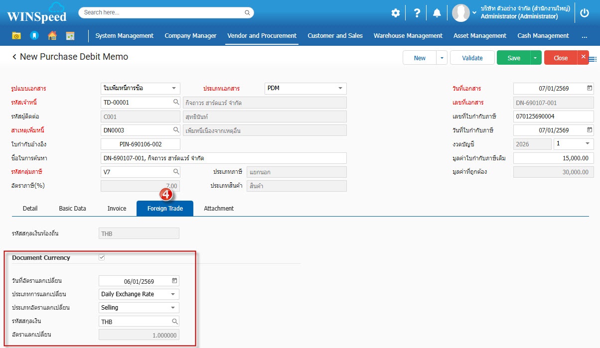 6.Foreign Trade บันทึกข้อมูลสกุลเงิน,อัตราแลกเปลี่ยน กรณีเป็นการซื้อจากผู้ขายต่างประเทศ