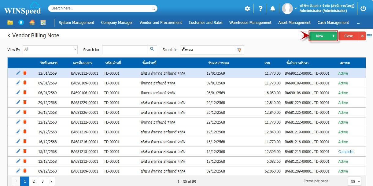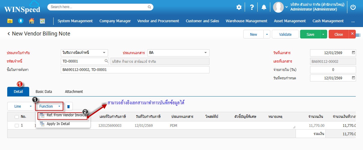 2.จากนั้นโปรแกรมจะขึ้นหน้าต่าง “ใบรับวางบิลเจ้าหนี้” ผู้ใช้ New เพื่อไปบันทึกข้อมูลตั้งเจ้าหนี้อื่นๆตามตัวอย่าง.3.Basic Data ระบุรายละเอียดข้อมูลต่างๆ ของเอกสารใบรับวางบิลเจ้าหนี้
