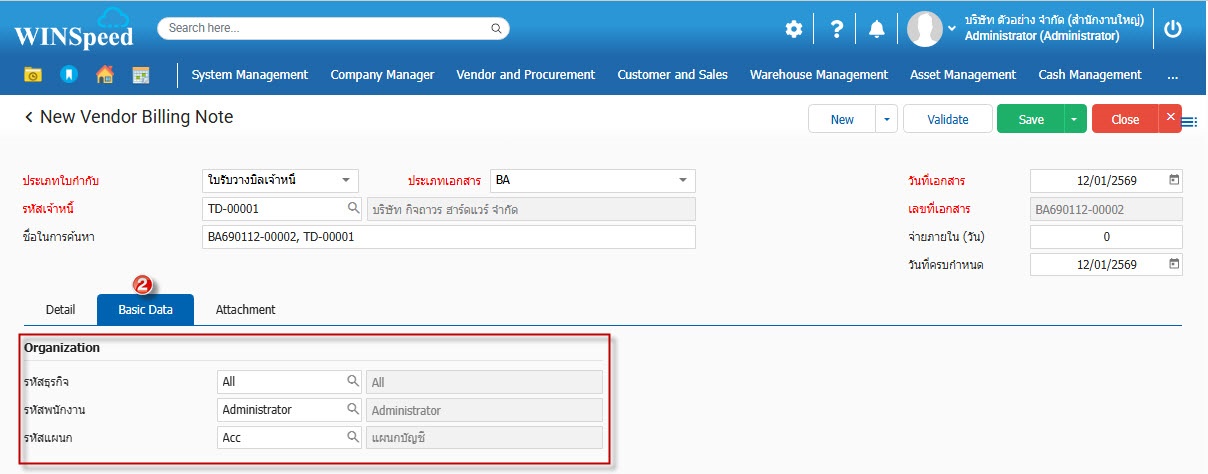 4.Basic Data บันทึกรายละเอียดเพิ่มเติมสำหรับใช้ในการบันทึกใบรับวางบิล เช่น รหัสธุรกิจ, รหัสพนักงาน, รหัสแผนก