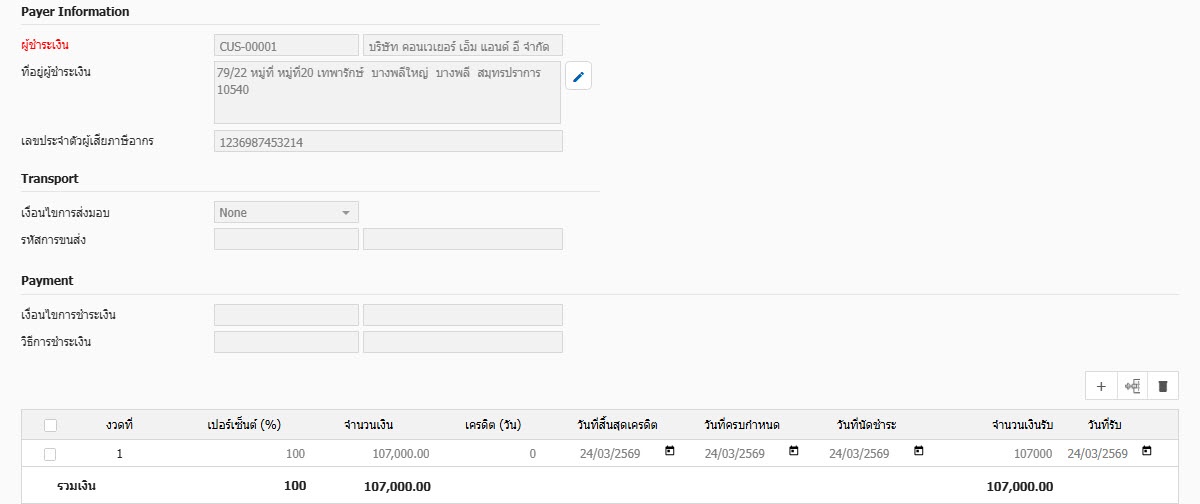 5.Invoice บันทึกรายละเอียดเพิ่มเติมสำหรับใช้ในการบันทึกตั้งหนี้เช่น ที่อยู่ในเปิดบิลของผู้ซื้อ พนักงานขายและหน่วยงาน งวดการจ่าย