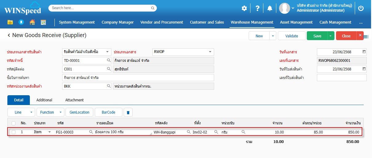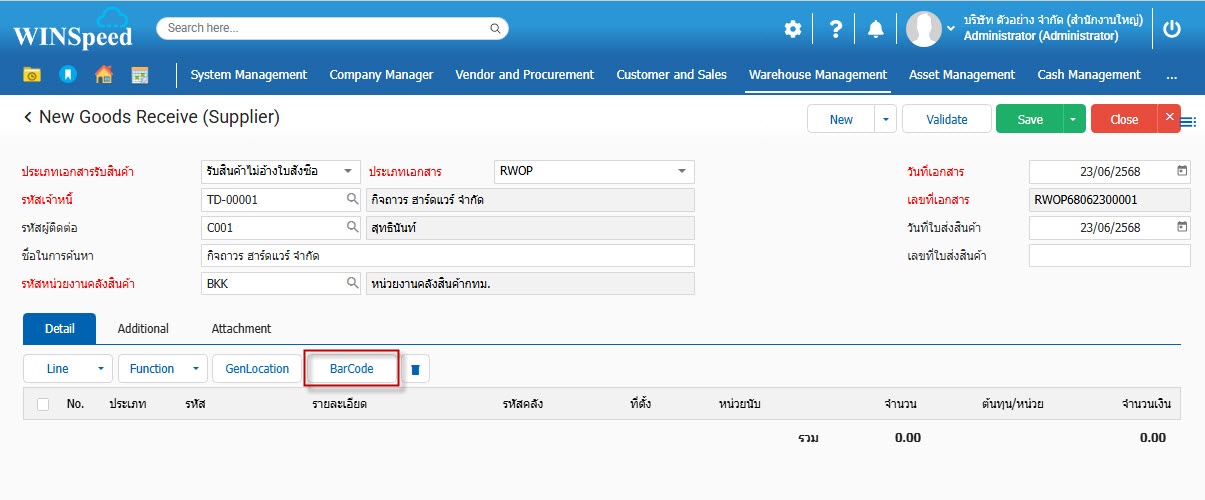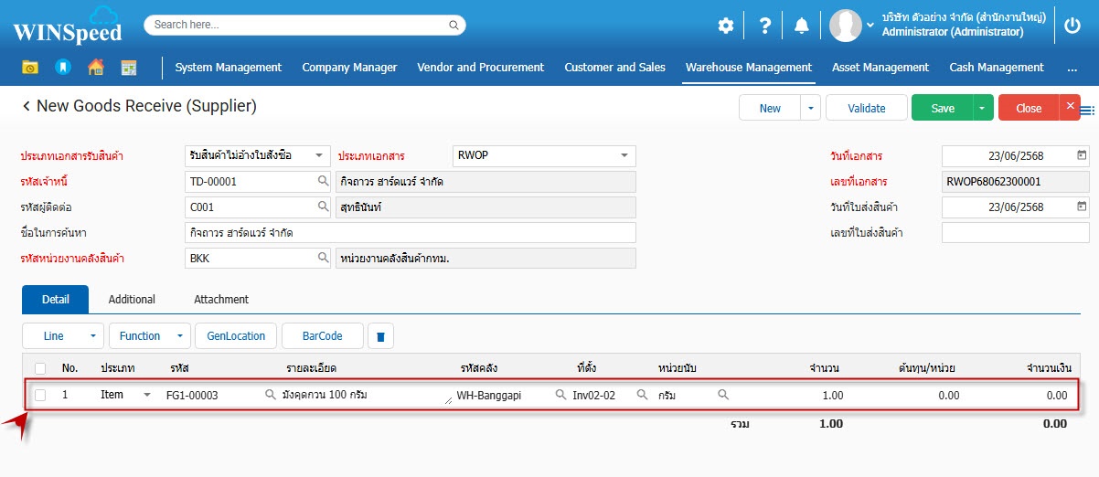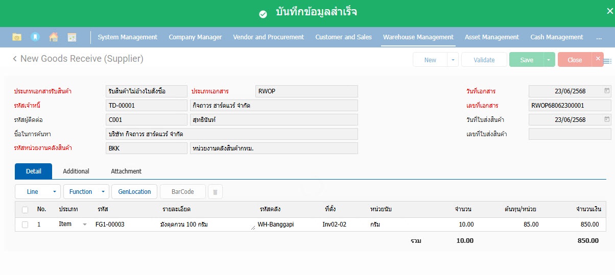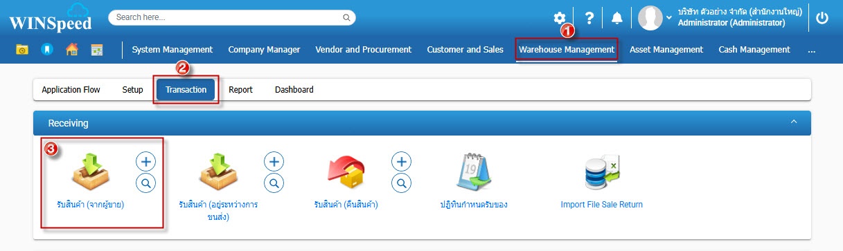 1.สามารถเข้าไปที่ Warehouse Mangement >Transaction>Receiving>รับสินค้า (จากผู้ขาย)