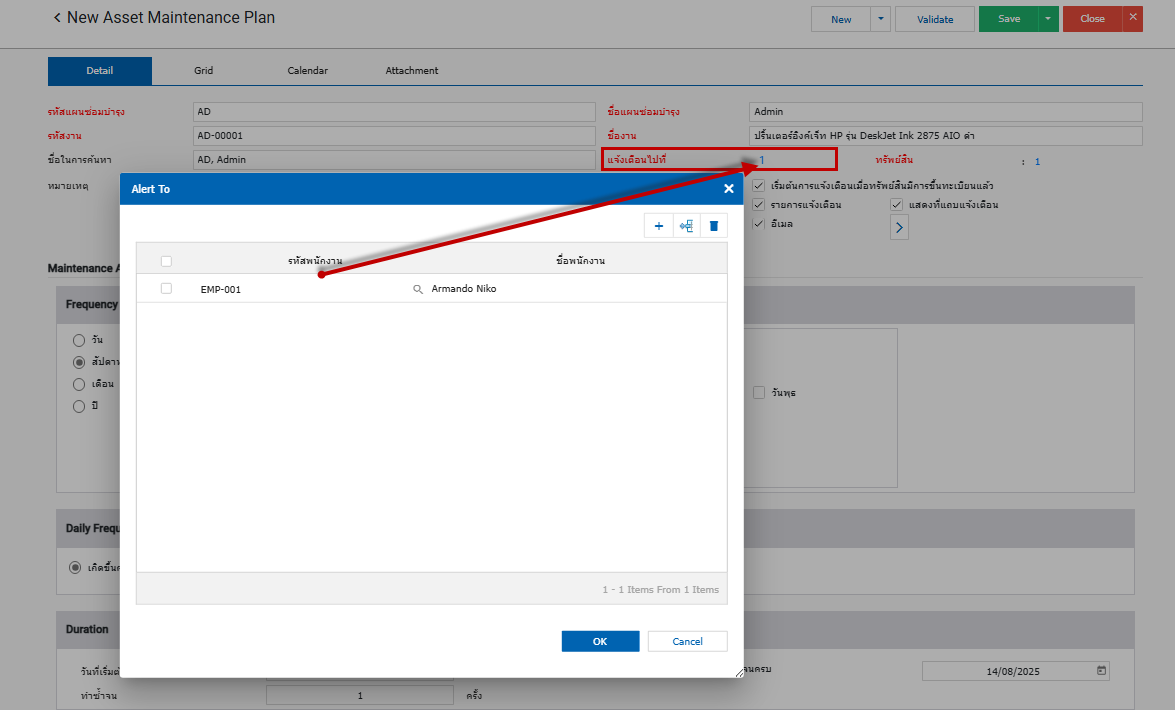 2.จากนั้นทำการกำหนดช่องแจ้งเตือนไปที่ 1 โดยคลิกเข้าไปเลือกพนักงานที่ต้องการแจ้งเตือนของการซ่อมบำรุง
