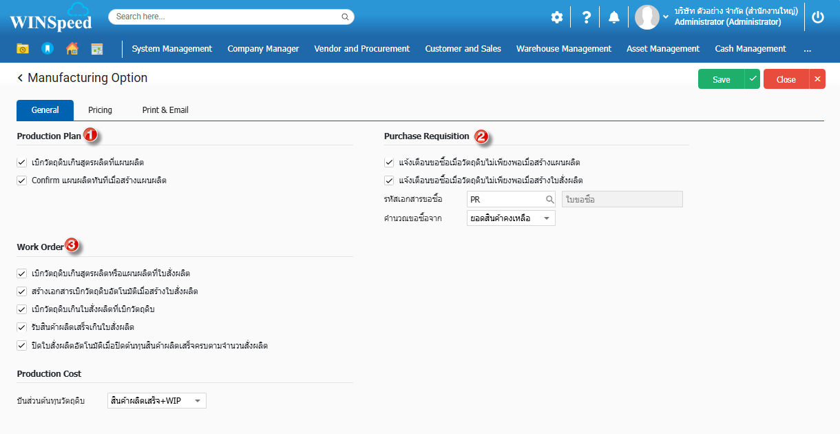 รายละเอียดหน้าต่างตั้งค่า Manufacturing -> General Setup