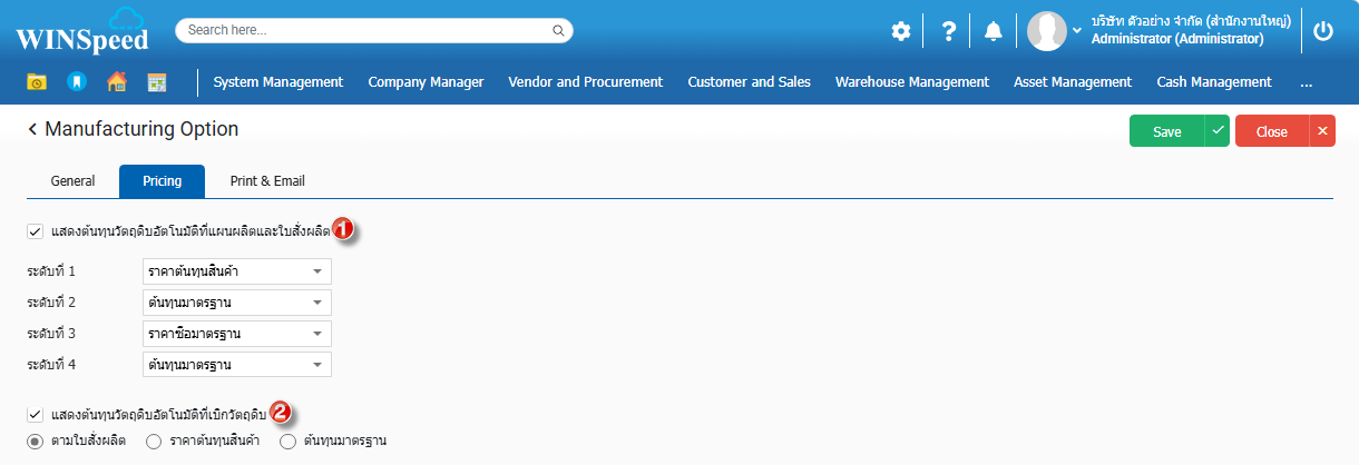 ตั้งค่าระบบผลิต (Manufacturing Option) คือ การกำหนดเงื่อนไขอื่นๆที่เป็นงานระบบการผลิต พร้องกับการตั้งค่าของต้นทุนสินค้า เป็นต้น ได้ซึ่งมี 3 ส่วน