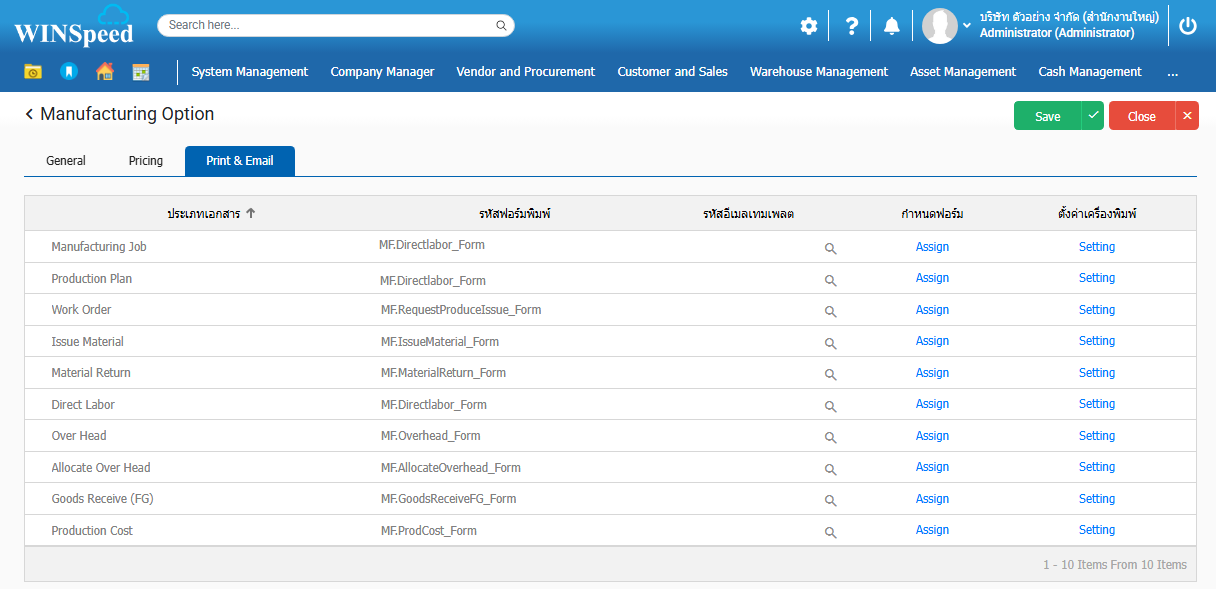3.Tab Print & Email สำหรับกำหนดฟอร์มใช้ในการพิมพ์เอกสาร, รหัสเทมเพลทในการส่งอีเมล์,Assign Form, การตั้งค่าเครื่องพิมพ์