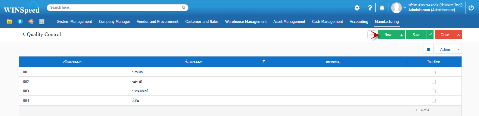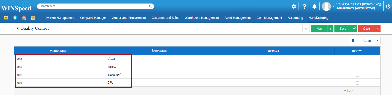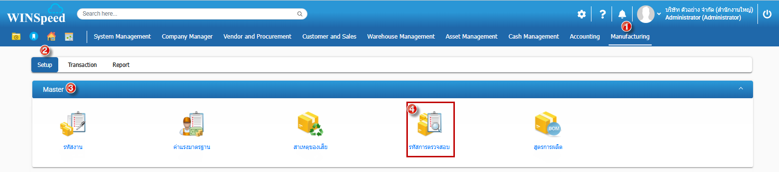 1.สามารถเข้าที่ระบบ Manufacturing > Setup > Master > คลิกรหัสการตรวจสอบ