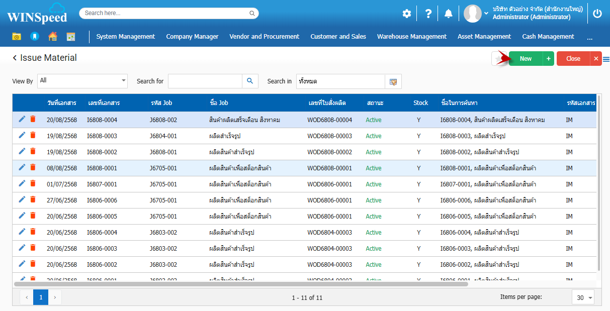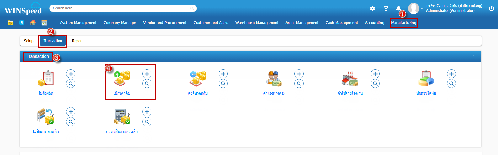 1.สามารถเข้าที่ระบบ Manufacturing > Transaction > Transaction >เบิกวัตถุดิบ