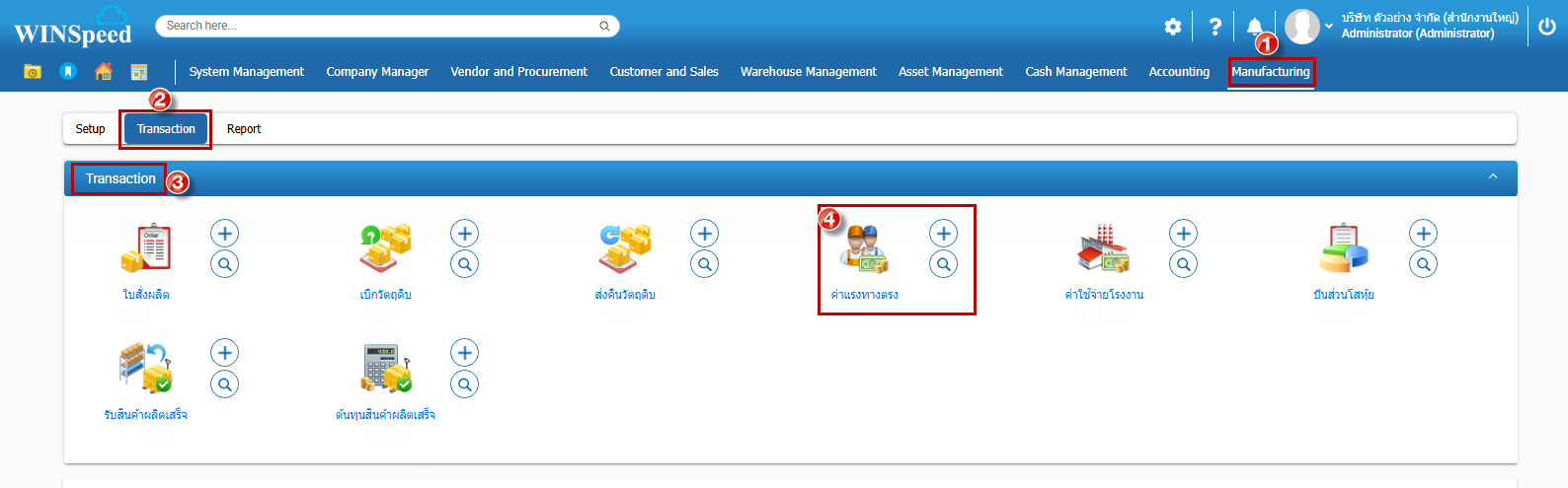 1.สามารถเข้าที่ระบบ Manufacturing > Transaction > Transaction >ค่าแรงทางตรง
