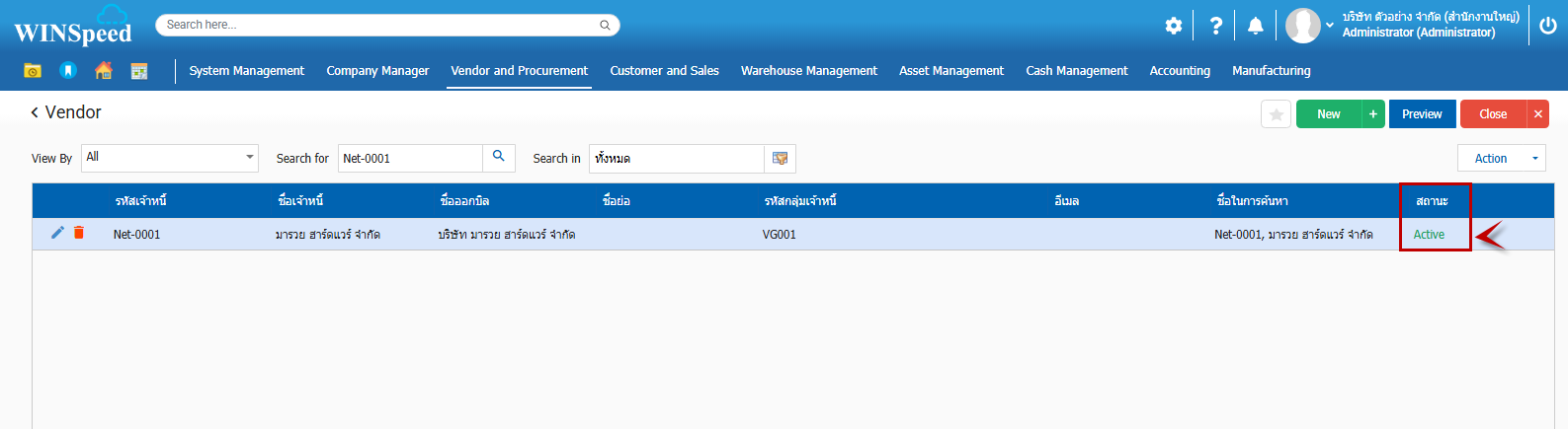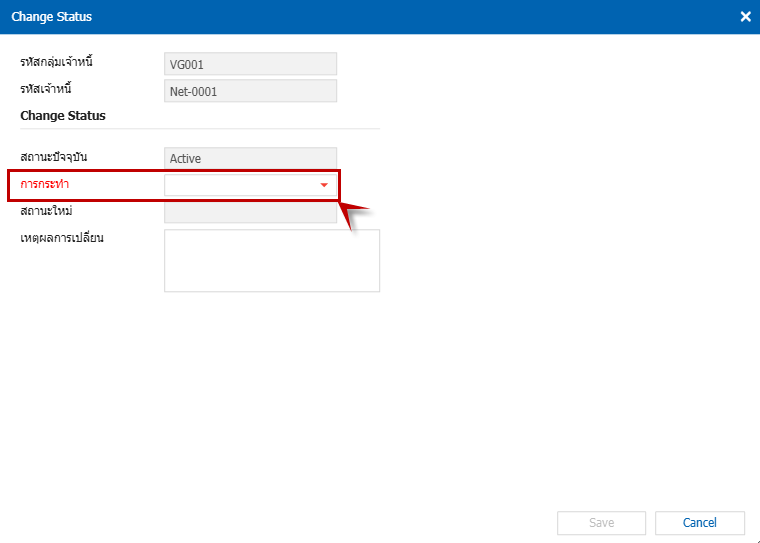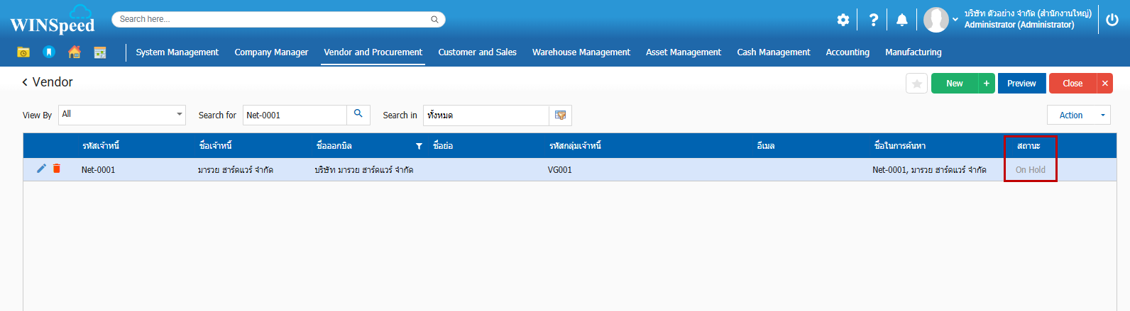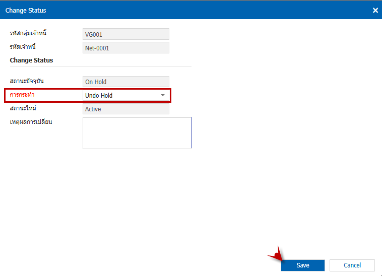 1.คืนสถานะเจ้าหนี้ ที่มีสถานะ On Hold มาเป็น Active 2.สามารถเข้าไปที่ Vendor and Procurement>Setup > Master > ข้อมูลเจ้าหนี้ 3.ปรากฏหน้าต่างเจ้าหนี้โดยให้ผู้ใช้ทำการกำหนดตามลำดับ (1) นำเมาส์คลิกให้คุมสีเทา (2) Action (3) Change Status 4.เมื่อ Change Status จะปรากฏหน้าต่าง Change Status ตรงช่องการกระทำ จะมีลูกศร ให้เลือก Undo Hold ขึ้นมาตามรูปที่ 5 5.เมื่อเลือก Undo Hold และทำการ Save 6.เมื่อคลิก Save จะมี ข้อความแจ้งเตือน “Active ข้อมูลสำเร็จ” คลิก OK 7.เมื่อบันทึกแล้ว ในหน้าต่างเจ้าหนี้ จะคืนสถานะจาก On Hold เป็น Active ให้ และสามารถดึงไปทำรายการต่อได้ปกติ