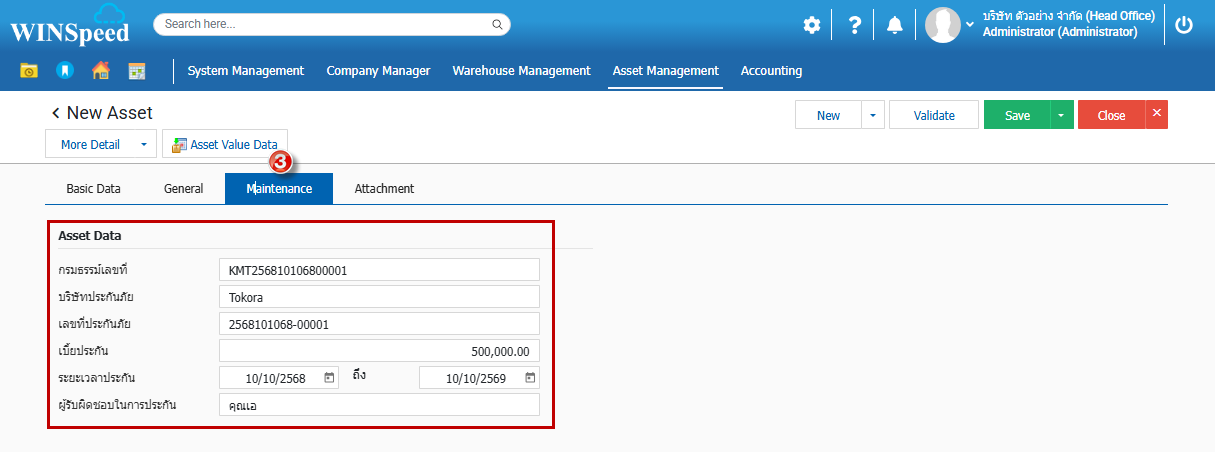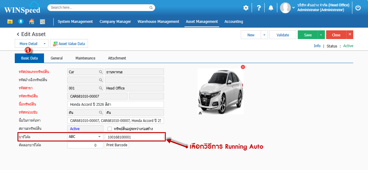 3.จากนั้นเลือก Tab Number Range และคลิกรันเลขอัตโนมัติ พร้อมกับกำหนด Format เลขที่ Running Bar Code 13 หลักตามรูปของผู้ใช้ (หมายเหตุ : รองรับเลขที่ Bar Code เป็นตัวเลขเท่านั้น) จากนั้นก็ทำการ Save ขั้นนตอนการบันทึกทรัพย์สินที่เป็นการ Running Auto เลขที่ Bar Code มีขั้นตอนการบันทึกดังนี้ 4.สามารถเข้าไปที่ Asset Management > Setup >Master> ทรัพย์สิน > คลิกทรัพย์สิน เพื่อบันทึกรายงานทรัพย์สินที่มี Bar Code 5. Basic Data จะปรากฏหน้าต่างทรัพย์สินเพื่อให้บันทึกข้อมูลเกี่ยวข้องกับทรัพย์สิน ช่องบาร์โค้ด สามารถเลือกประเภทการ Run เลขที่ Bar Code แบบ Auto 6.Tab General ทั่วไปบันทึกรายละเอียดเลขที่รุ่น หมายเลขซีเรียล และอื่นๆ สามารถระบุตามลำดับ