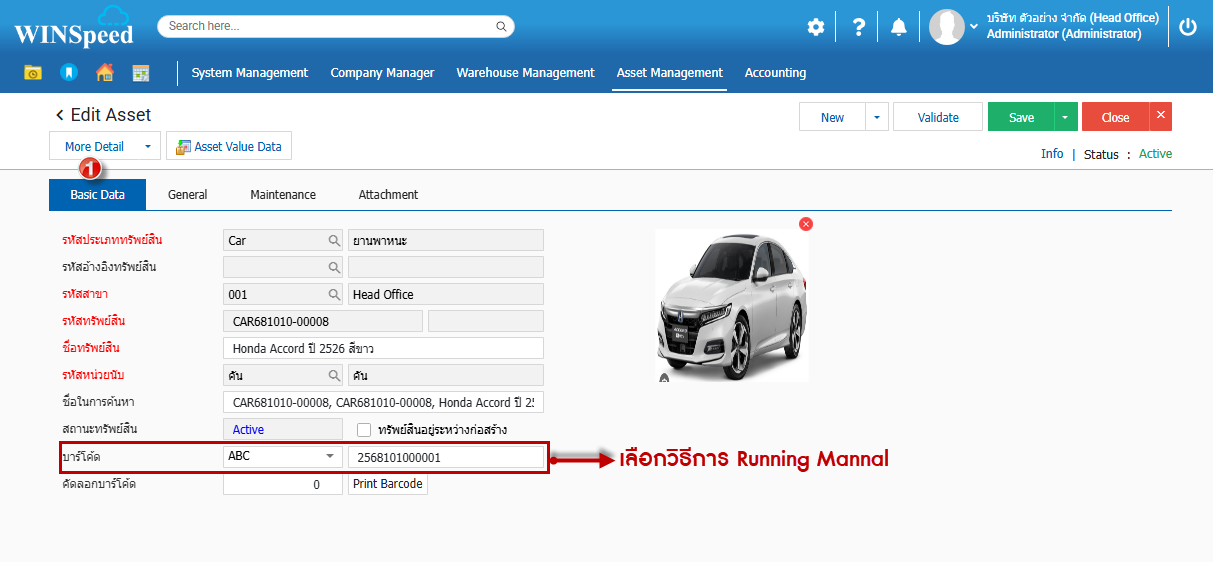 2. Basic Data จะปรากฏหน้าต่างทรัพย์สินเพื่อให้บันทึกข้อมูลเกี่ยวข้องกับทรัพย์สิน ช่องบาร์โค้ด สามารถเลือกประเภทการ Run เลขที่ Bar Code แบบ Manual