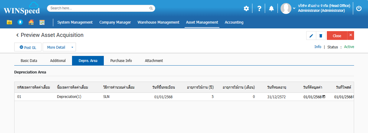 7.Tab Depre. Area เพื่อแสดงเขตการคิดค่าเสื่อม วิธีการคำนวณค่าเสื่อม อายุการใช้งานของทรัพย์สิน และวันที่คิดมูลค่า วันที่โพสต์ เป็นต้น