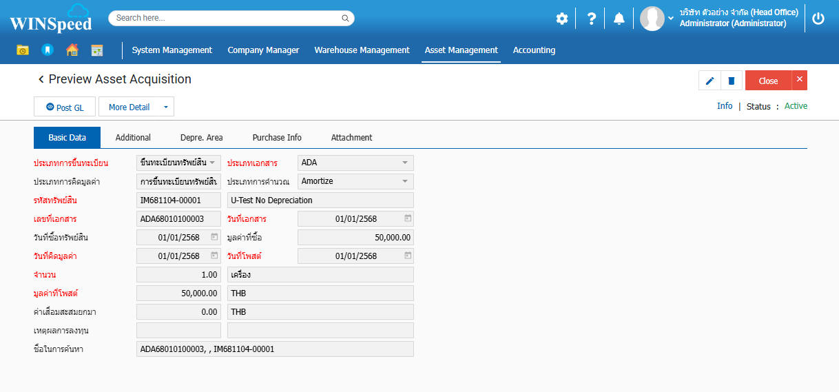 5.Tab Basic Data เพื่อกำหนดรายละเอียดพื้นฐานขึ้นทะเบียนทรัพย์สิน เช่น ประเภทการขึ้นทะเบียน ประเภทเอกสาร รหัสทรัพย์สิน วันที่คิดมูลค่า วันที่โพสต์ จำนวน มูลค่าที่โพสต์ เป็นต้น