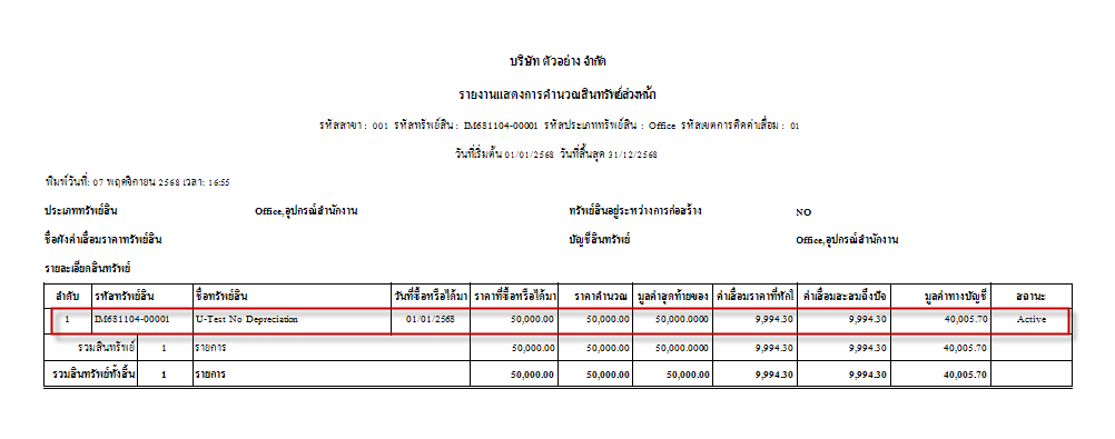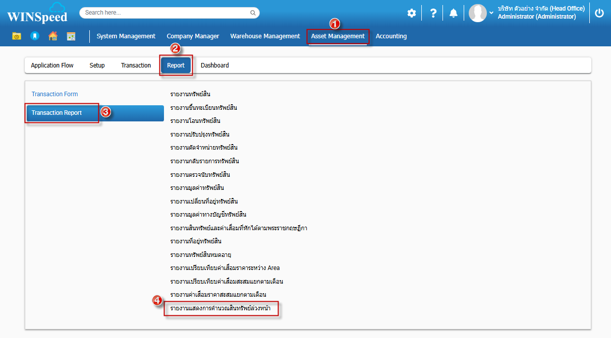 8.1 สามารถเข้าไปที่ Asset Management > Report > Transaction Report > รายงานแสดงการคำนวณสินทรัพย์ล่วงหน้า