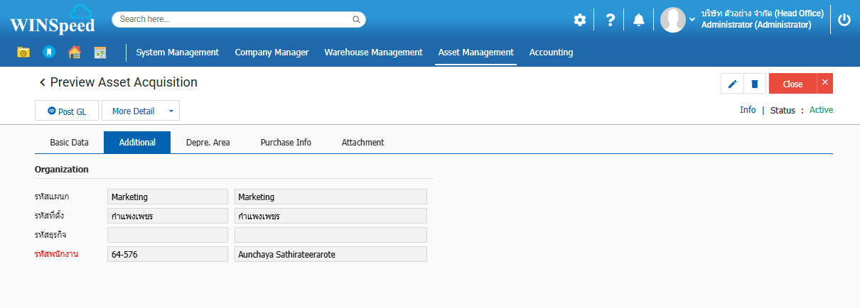6.Tab Additional เพื่อกำหนดรายละเอียดค่าเริ่มต้นของข้อมูลแผนก รหัสที่ตั้ง รหัสธุรกิจ ชื่อพนักงาน เป็นต้น