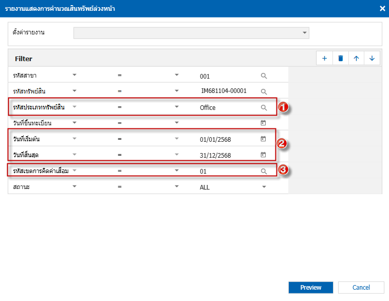ขั้นตอนการทำงานและเรียกรายงานแสดงการคำนวณสินทรัพย์ล่วงหน้าก่อนการคำนวณค่าเสื่อมทรัพย์สิน มีขั้นตอนดังนี้