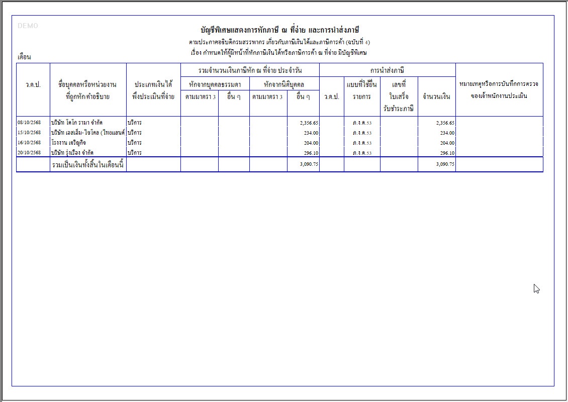 - สามารถพิมพ์รายงานบัญชีพิเศษภาษีหัก ณ ที่จ่ายจากโปรแกรมได้