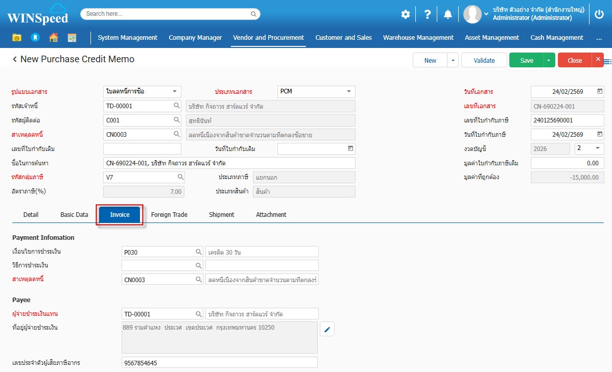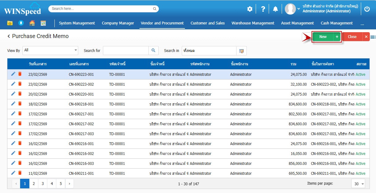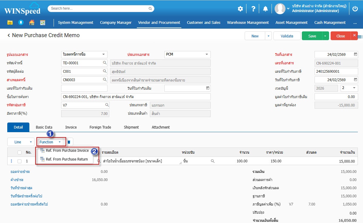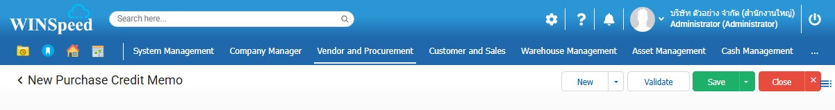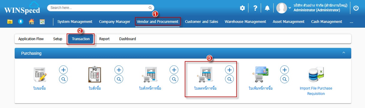 1.สามารถเข้าไปที่ Vendor and Procurement > Transaction > Purchasing > ใบลดหนี้การซื้อ