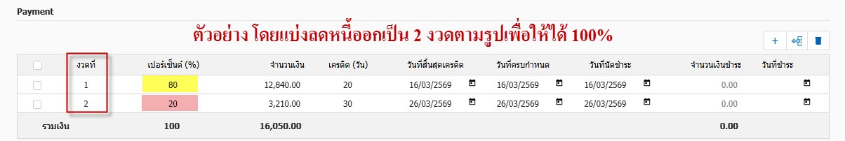 4.Tab Invoice บันทึกเกี่ยวกับเงื่อนไขการชำระเงิน สาเหตุการลดหนี้ และส่วยของ Payment สามารถแบ่งจ่ายการลดหนี้ได้เป็นงวดๆ ตามตัวอย่างข้างต้น