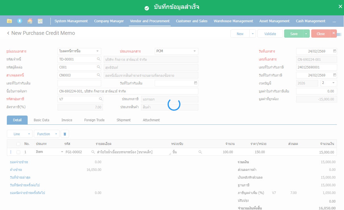 5.เมื่อกำหนดเสร็จแล้วก็สามารถทำการบันทึกข้อมูลใบลดหนี้การซื้อ