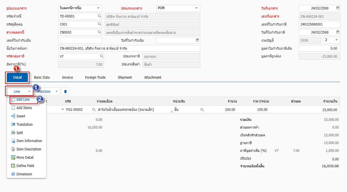 Detail บันทึกรายละเอียดเอกสารใบลดหนี้จากการซื้อ สามารถบันทึกโดย Add Line สินค้ามาเอง