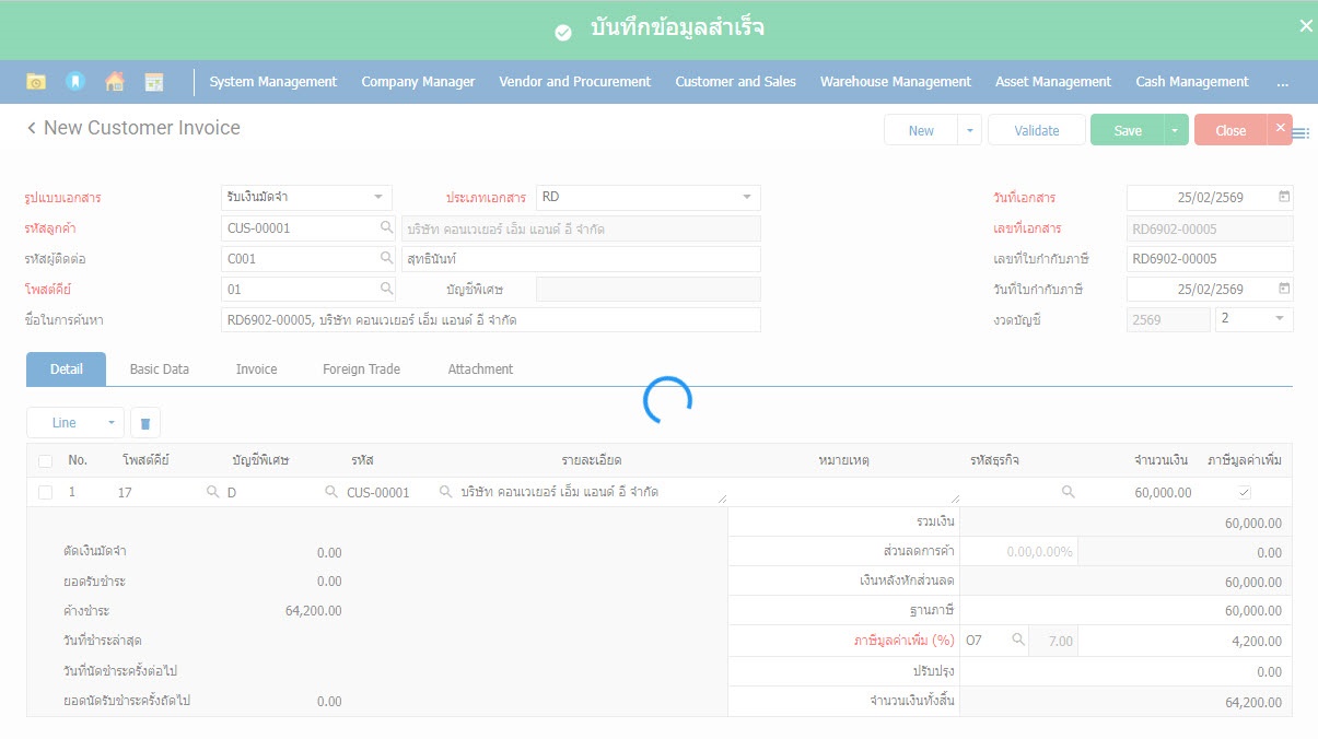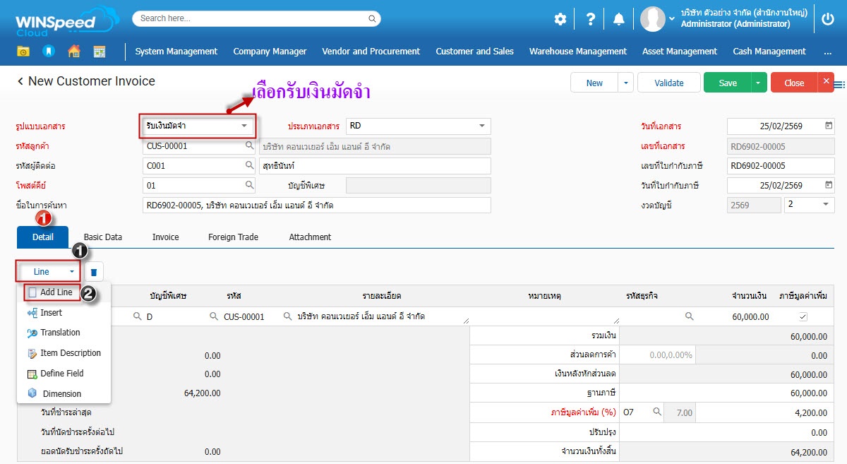 Detail บันทึกรายละเอียดเอกสารรับเงินมัดจำ สามารถบันทึกโดย Add Line สินค้ามาเอง