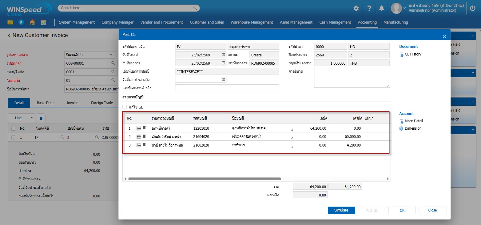 8.เมื่อคลิก Simulate ผังบัญชีจะปรากฏขึ้นด้าน Dr./Cr. ที่มีการผูกไว้ข้างต้น