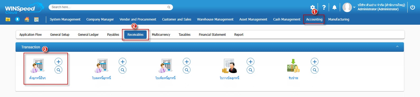 4.เมื่อกำหนดบัญชีและผังแล้วให้ไปทำการบันทึกเจ้าหนี้อื่นๆ (รับเงินมัดจำ) สามารถเข้าไปที่ Accounting > Receivables >Transaction >ตั้งลูกหนี้อื่นๆ (เลือกรับเงินมัดจำ)