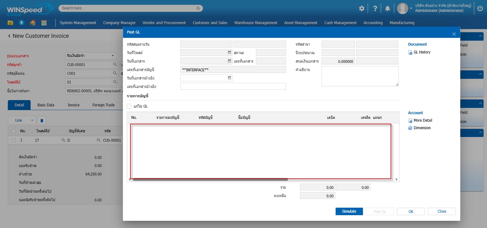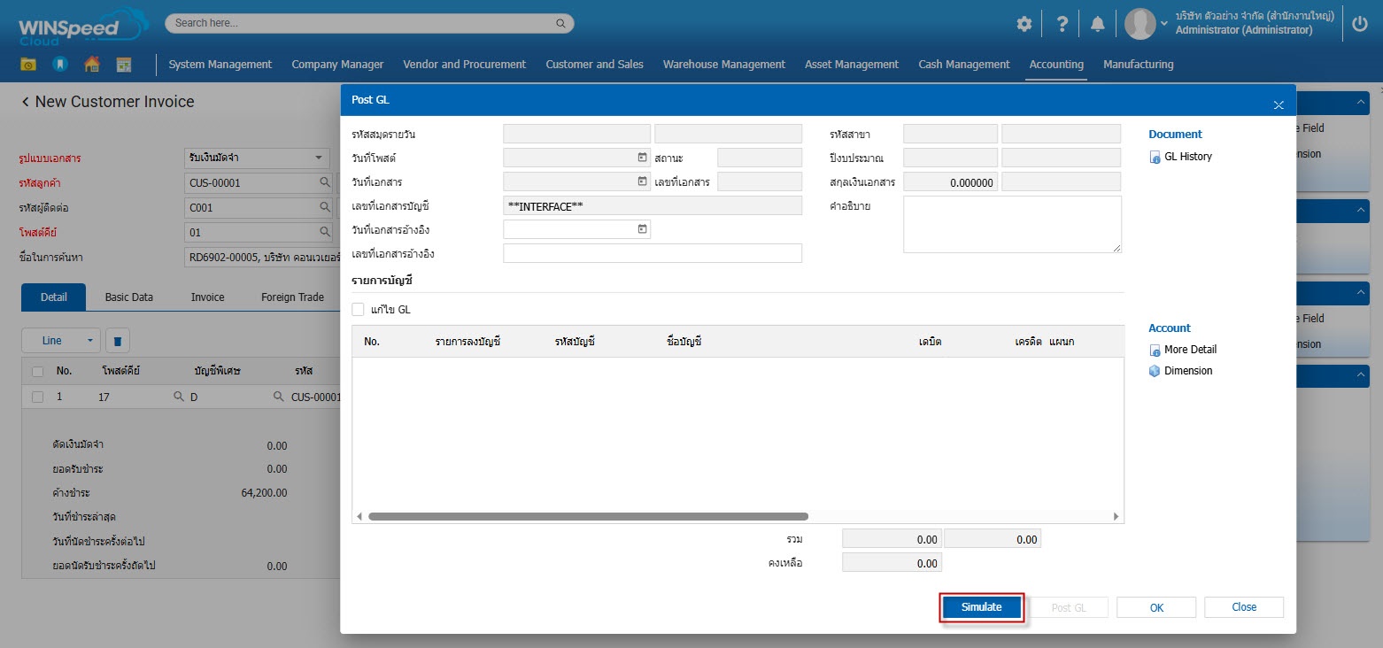 7.เมื่อคลิกเข้าไปแล้วจะปรากฏหน้าต่าง Post GL ให้ผู้ใช้คลิก Simulate