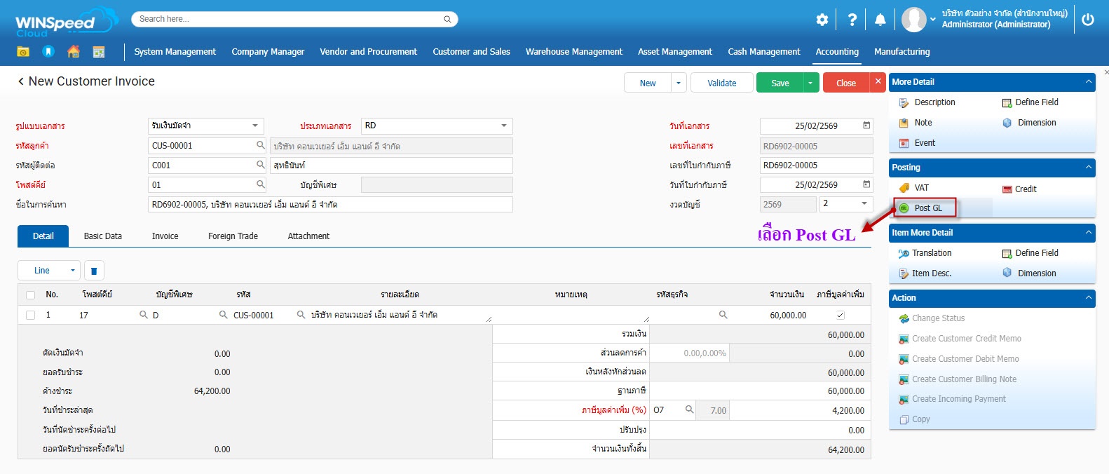 6.Tab Post GL บันทึกเกี่ยวกับบัญชีของรับเงินมัดจำ ตามตัวอย่างข้างต้น